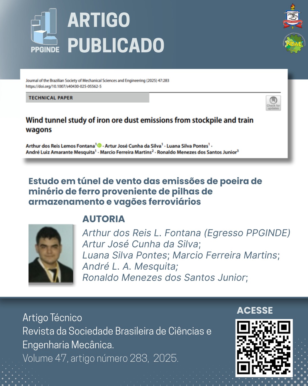 O PPGINDE divulga o artigo intitulado “Wind tunnel study of iron ore dust emissions from stockpile and train wagons” (Estudo em túnel de vento das emissões de poeira de minério de ferro proveniente de pilhas de armazenamento e vagões ferroviários) de autoria de Arthur dos Reis L. Fontana, Artur José Cunha da Silva, Luana Silva Pontes, Marcio Ferreira Martins, André L. A. Mesquita e Ronaldo Menezes dos Santos Junior.