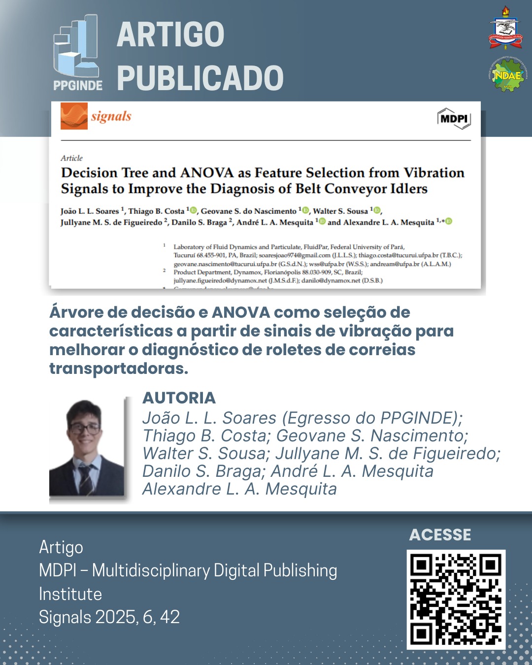 O PPGINDE divulga o artigo intitulado “Decision Tree and ANOVA as Feature Selection from Vibration Signals to Improve the Diagnosis of Belt Conveyor Idlers” (Árvore de decisão e ANOVA como seleção de características a partir de sinais de vibração para melhorar o diagnóstico de roletes de correias transportadoras.) de autoria de João L. L. Soares, Thiago B. Costa; Geovane S. Nascimento, Walter S. Sousa; Jullyane M. S. de Figueiredo, Danilo S. Braga, André L. A. Mesquita e Alexandre L. A. Mesquita
