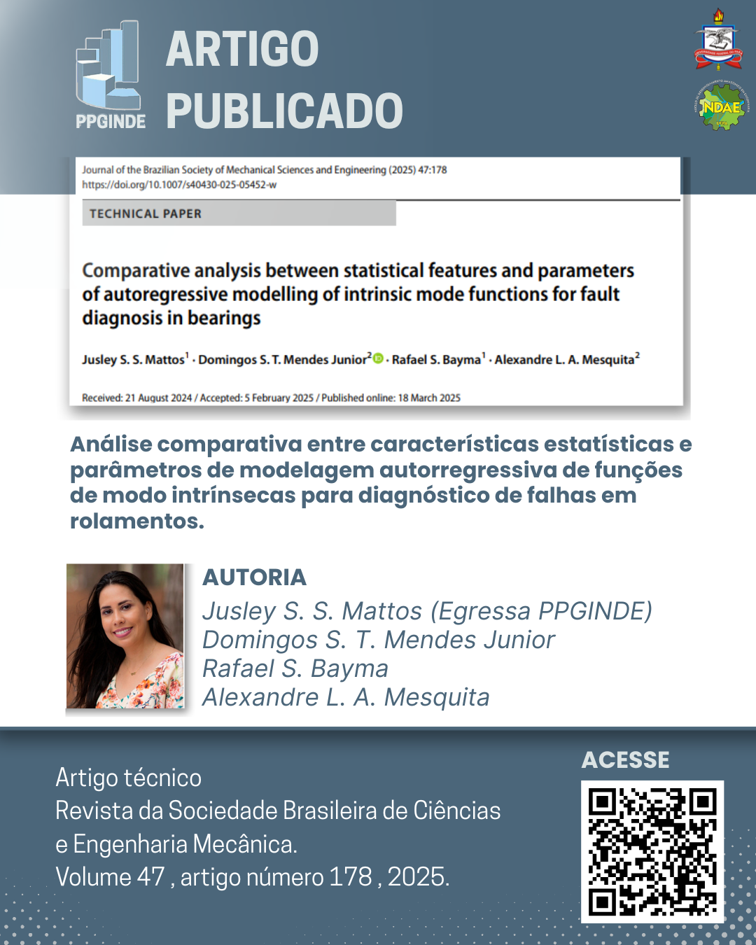 O PPGINDE divulga o artigo intitulado “Comparative analysis between statistical features and parameters of autoregressive modelling of intrinsic mode functions for fault diagnosis in bearings” (Análise comparativa entre características estatísticas e parâmetros de modelagem autorregressiva de funções de modo intrínsecas para diagnóstico de falhas em rolamentos) de autoria de Jusley S. S. Mattos, Domingos S. T. Mendes Junior, Rafael S. Bayma e Alexandre L. A. Mesquita.