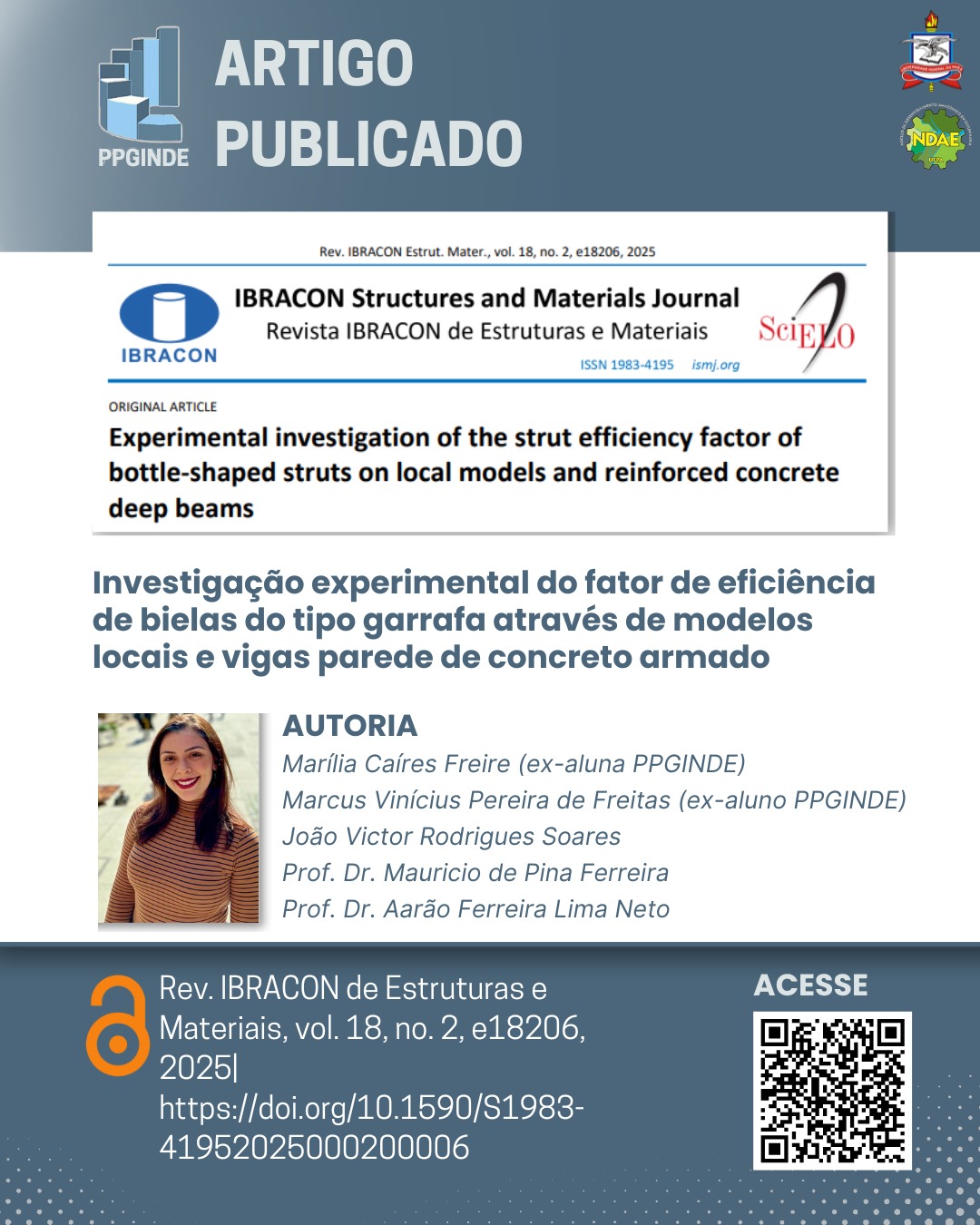 O PPGINDE divulga a publicação do artigo intitulado “Experimental investigation of the strut efficiency factor of bottle-shaped struts on local models and reinforced concrete deep beams”, de autoria Marília Caíres Freire (ex-aluna do PPGINDE), Marcus Vinícius Pereira de Freitas (ex-aluno do PPGINDE), João Victor Rodrigues Soares, Prof. Dr. Mauricio de Pina Ferreira e Prof. Dr. Aarão Ferreira Lima Neto.