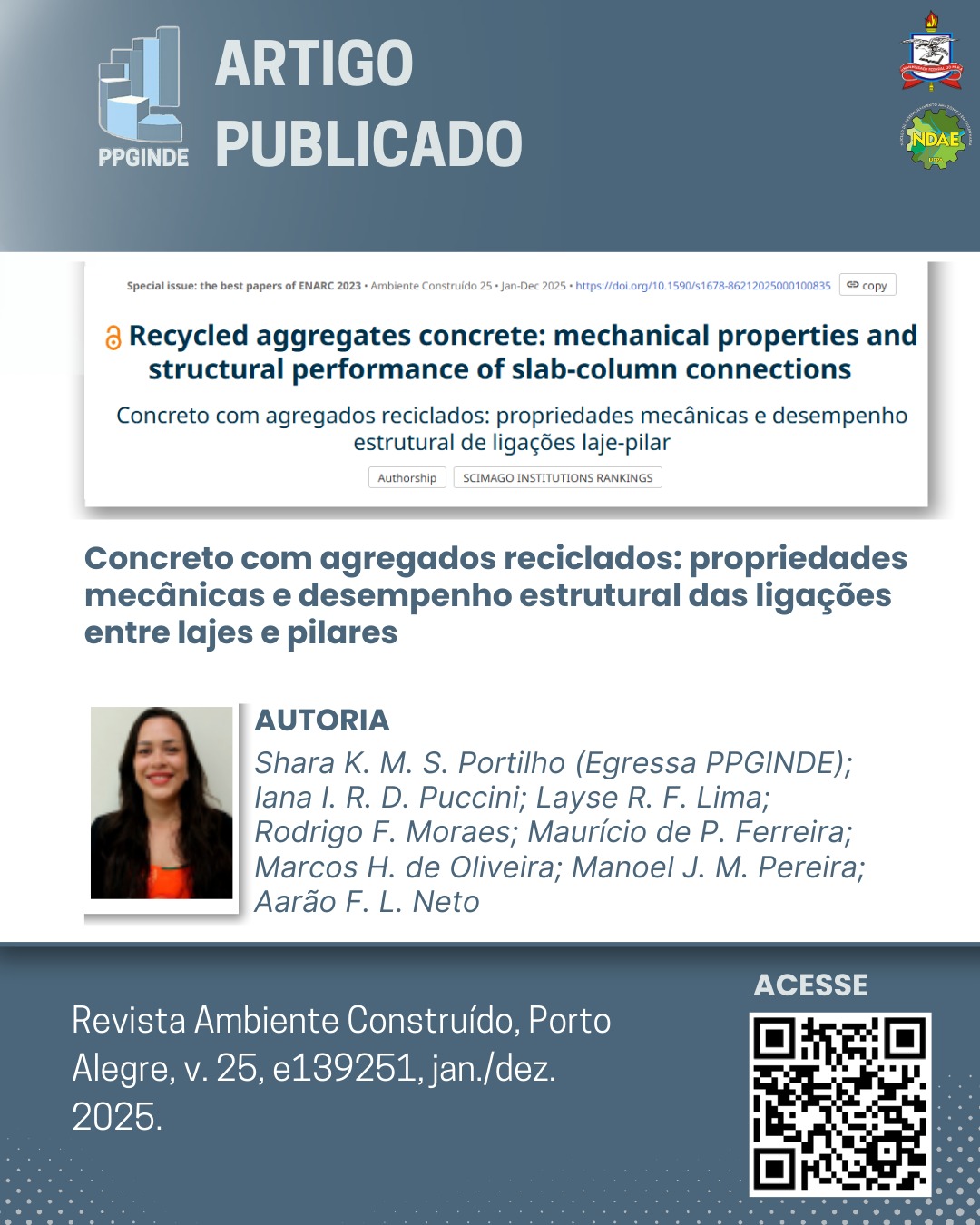 O PPGINDE divulga o artigo intitulado “Recycled aggregates concrete: mechanical properties and structural performance of slab-column connections” (Concreto com agregados reciclados: propriedades mecânicas e desempenho estrutural das ligações entre lajes e pilares) de autoria de Shara K. M. S. Portilho, Iana I. R. D. Puccini, Layse R. F. Lima, Rodrigo F. Moraes; Maurício de P. Ferreira, Marcos H. de Oliveira, Manoel J. M. Pereira e Aarão F. L. Neto.