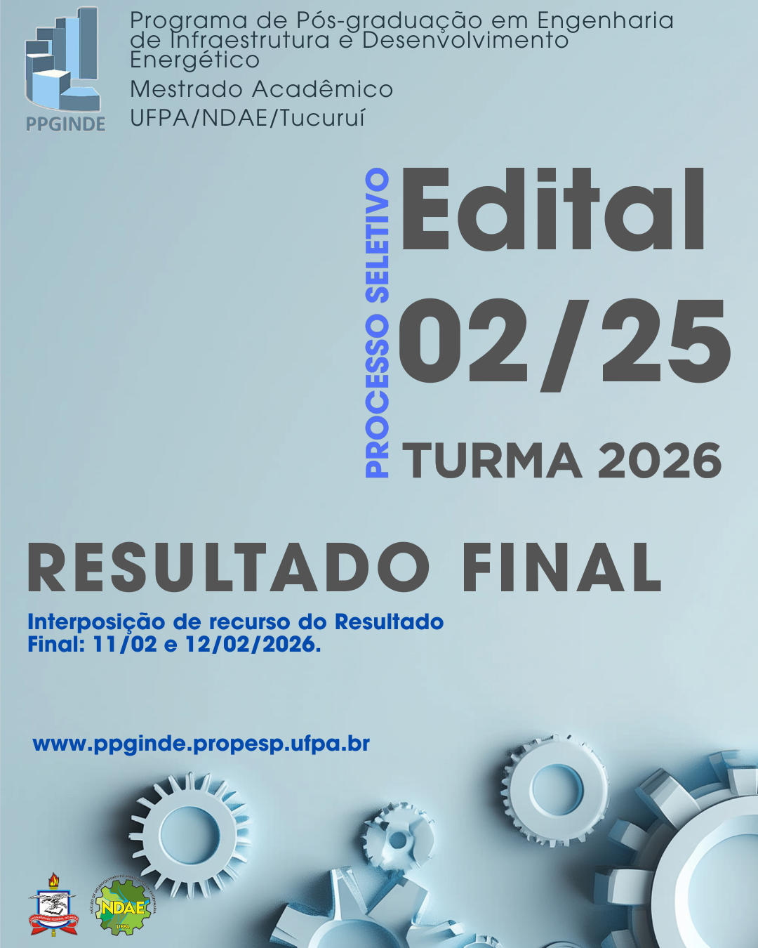 O Programa de Pós-graduação em Engenharia de Infraestrutura e Desenvolvimento Energético (PPGINDE), torna público o resultado final, após interposição de recursos, do Processo Seletivo regido pelo Edital no 02/2025 – RETIFICADO – PPGINDE / NDAE / UFPA que trata sobre o processo de seleção de alunos/as regulares e alunos/as especiais no curso de Mestrado Acadêmico em Engenharia de Infraestrutura e Desenvolvimento Energético, com ingresso no 1o semestre de 2026.